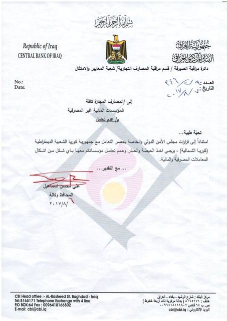 دعا البنك المركزي، الاربعاء، الى حظر تعامل المصارف العراقية مع كوريا الشمالية، مشيرة الى ان ذلك ياتي استنادا الى قرارات مجلس الامن الدولي والخاصة بحظر التعامل معها.