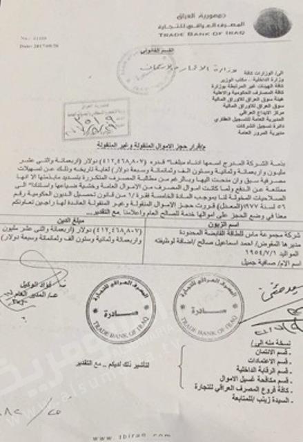 وكشف حيدر عن "وثيقة وصلت اليه تشير الى مطالبة المصرف التجاري بوضع اليد وحجز الاموال المنقولة وغير المنقولة لشركة الماس القابضة لوجود مبلغ بذمتها يتجاوز الـ 412 مليار دولار وذلك عن تسهيلات مالية سبق وان قدمت للشركة من قبل المصرف".
