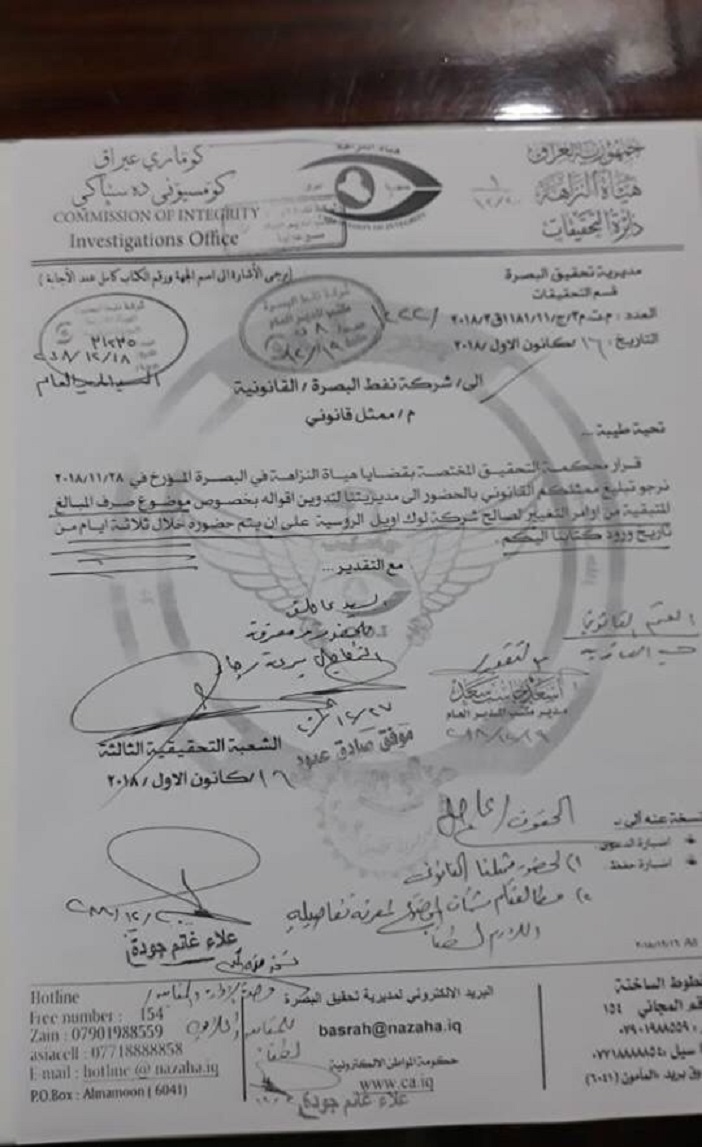 وطلبت الهيأة وفق الوثائق من الشركة "حضور ممثلها القانوني الى مديرية هيأة النزاهة لتدوين أقواله بخصوص موضوع صرف المبالغ المتبقية من أوامر التغيير لصالح شركة (لوك أويل) الروسية".