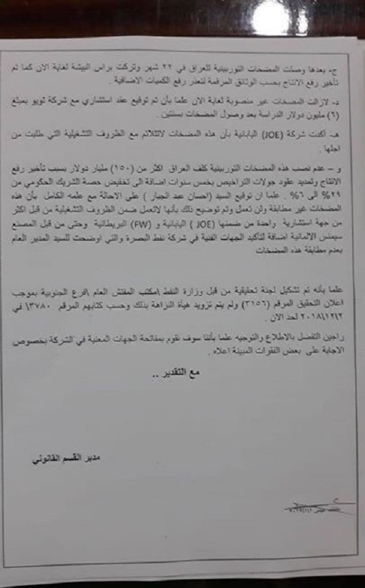 وتشير وثائق، تعاقد مدير الشركة، على شراء مضخات توربينية رغم تأكيد مصنعتها شركة (سيمنس) الالمانية أنها لا تعمل في الظروف التشغيلية، ليتسبب عدم نصبها في تكليف العراق أكثر من 150 مليار دولار.