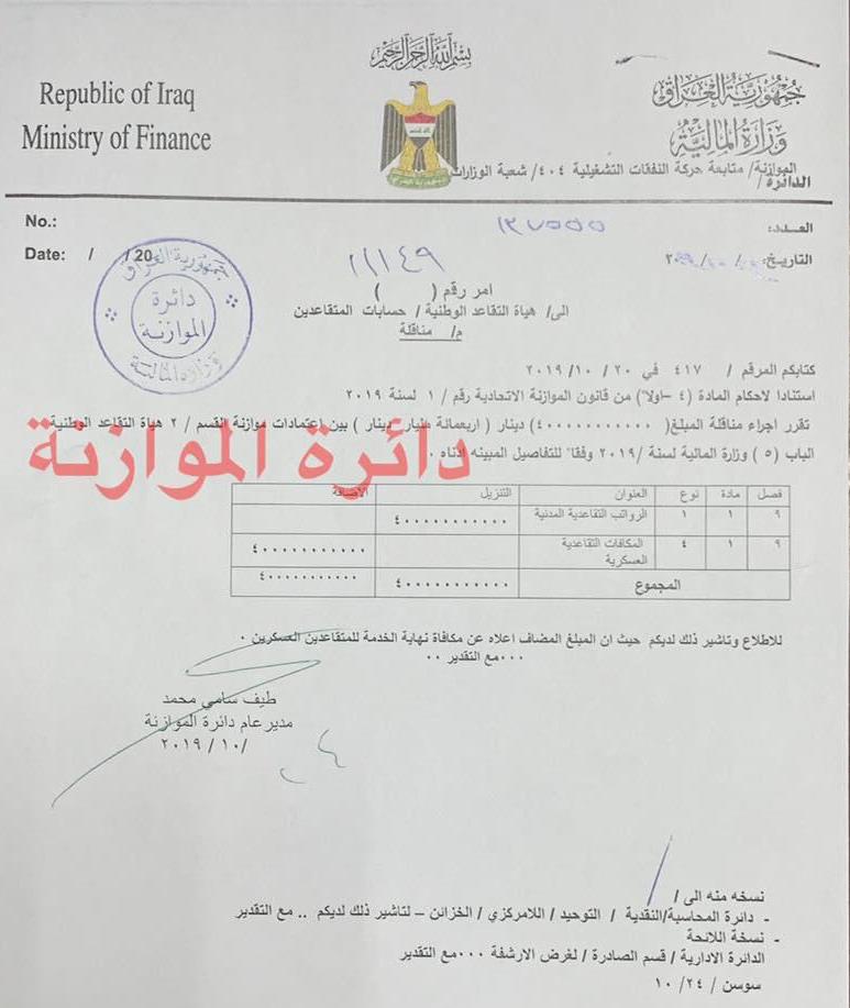 وبحسب وثيقة نشرتها وكالة الانباء العراقية الرسمية انه "تمت مناقلة اربعة مليارات دينار من اجل صرف مكأفاة نهاية الخدمة للمتقاعدين المدنيين والعسكريين".