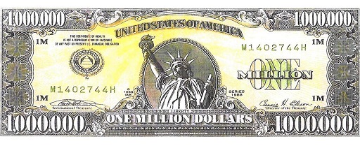 وأوضح أنها "ورقة تذكارية غير متداولة في أسواق النقد العالمية صادرة عن جمعية المليونيرات الامريكية"، مبينا أن "هذه الورقة لا تعد نقدية لكونها غير صادرة عن البنك الفيدرالي الامريكي ولا تمثل أي سند مالي، وتُستعمل لأغراض الإهداء فقط، و أن أعلى فئة بالتداول للدولار الأمريكي هي فئة 100 دولار".