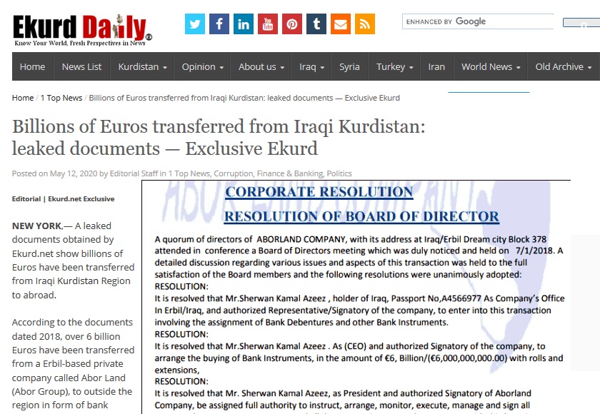 وذكر الموقع في خبر انه ” وطبقا للوثائق المؤرخة في عام 2018 فقد تم تحويل مبلغ 6 مليار يورو من شركة خاصة يقع مقرها في اربيل تسمى ( آبور لاند ) من مجموعة (Abor Group) الى خارج الاقليم تحت مسمى الاستثمار المصرفي”.