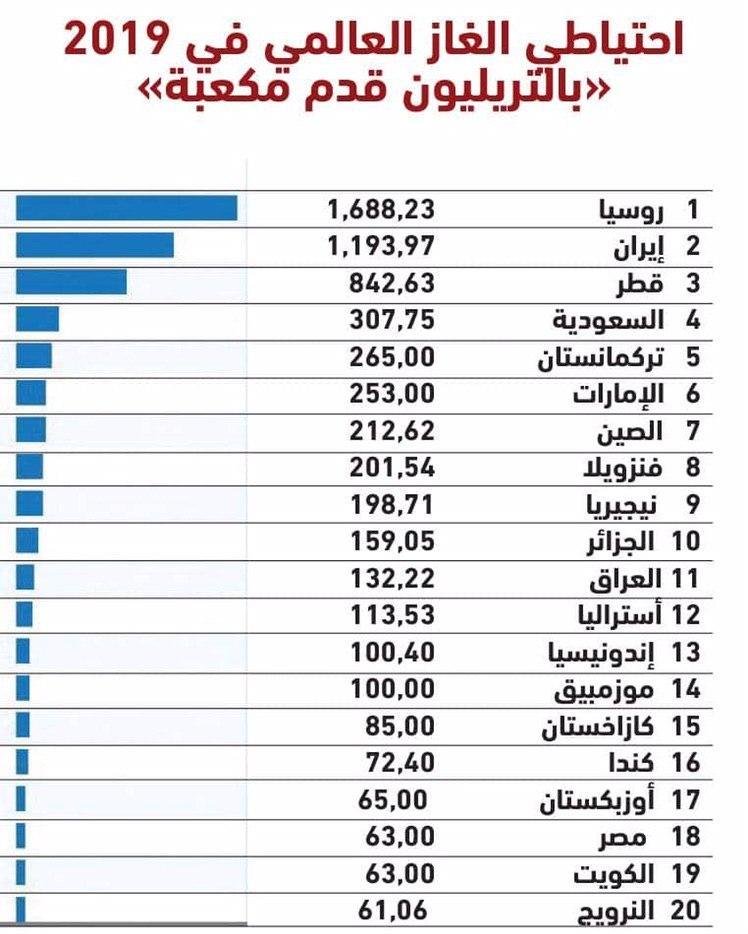 وحسب المنصة فقد احتل العراق المرتبة 11 عالميا بأكبر احتياطي للغاز بالعالم وبمقدار 132.22 ترليون قدم مكعب، مبينة ان روسيا جاءت بالمرتبة الاولى عالميا باحتياطي بلغ 1.688.23 ترليون قدم مكعب، يليها ايران بالمرتبة الثانية باحتياطي بلغ 1.193.97 ترليون قدم مكعب.