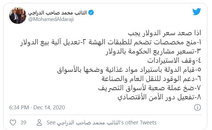 وقال الدراجي في تغريدة على حسابه في تويتر ، "اذا صعد سعر الدولار يجب،