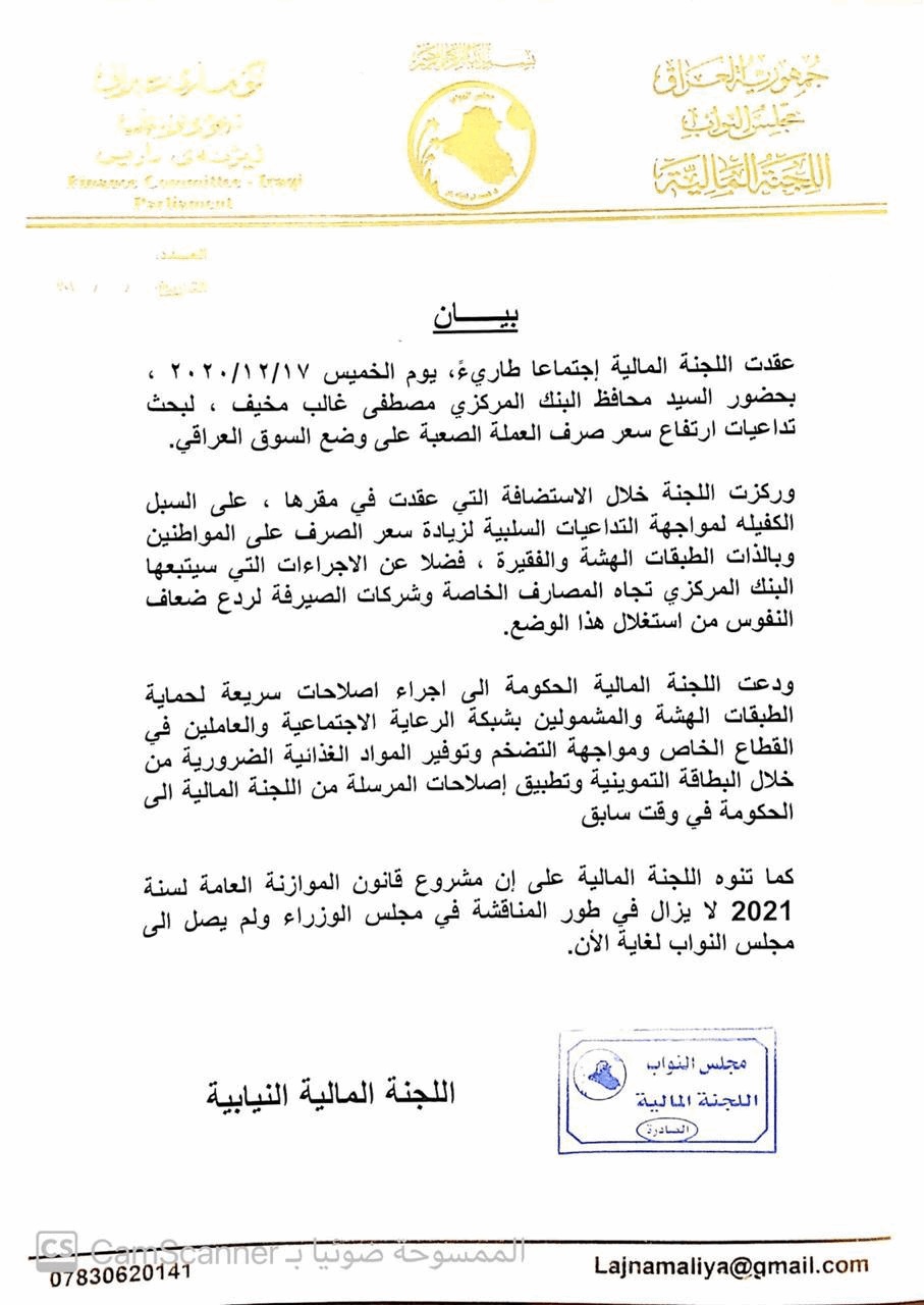 أصدرت اللجنة المالية النيابية، الخميس، بياناً بعد الاجتماع الذي عقدته بحضور محافظ البنك المركزي مصطفى غالب مخيف لبحث تداعيات ارتفاع سعر صرف العملة الصعبة على وضع السوق العراقي.