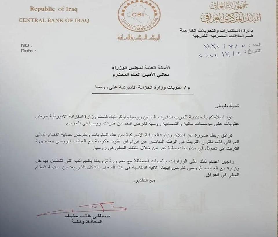 وبحسب وثيقة، تضمنت توجيه البنك المركزي العراقي كافة الوزارات بعدم ابرام اي عقود مع روسيا نتيجة العقوبات الأمريكية، وذلك لحماية على النظام المالي العراقي من العقوبات.