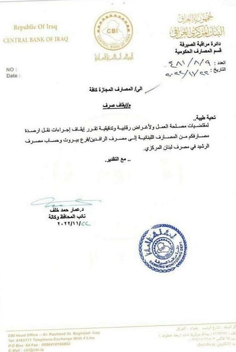 وأظهرت وثيقة قرار البنك المركزي العراقي الموجّه إلى المصارف العراقية كافة، أنه "لمقتضيات مصلحة العمل ولأغراض رقابية وتدقيقية تقرر إيقاف إجراءات نقل الأرصدة من المصارف اللبنانية إلى مصرف الرافدين فرع بيروت، وحساب مصرف الرشيد المركزي في مصرف لبنان المركزي".
