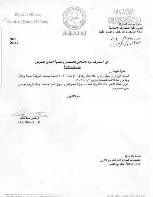 وبحسب وثيقة، فإنه "استناداً الى قرار مجلس هذا البنك رقم (36) لسنة 2023 المتخذ بجلسته المرقمة ستمئة واثنان وثلاثون بعد الالف المنعقدة بتاريخ 7/3/2023، تقرر اتخاذ الاجراءات القانونية بسحب إجازة مصرفكم وتعيين (محمد جواد كريم) كوصي على المصرف".