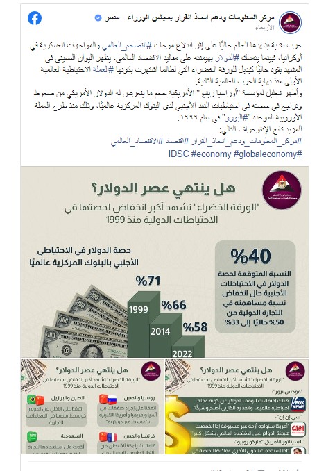 وخلال انفوغرافيك نشره مركز المعلومات، أوضح أن هناك احتمالات لتوقف الدولار عن كونه عملة احتياطية عالمية، وانحداره الكارثي أصبح وشيكا، وأمريكا ستواجه أزمة غير مسبوقة إذا انخفضت هيمنة الدولار على الاقتصاد العالمي بشكل كبير.