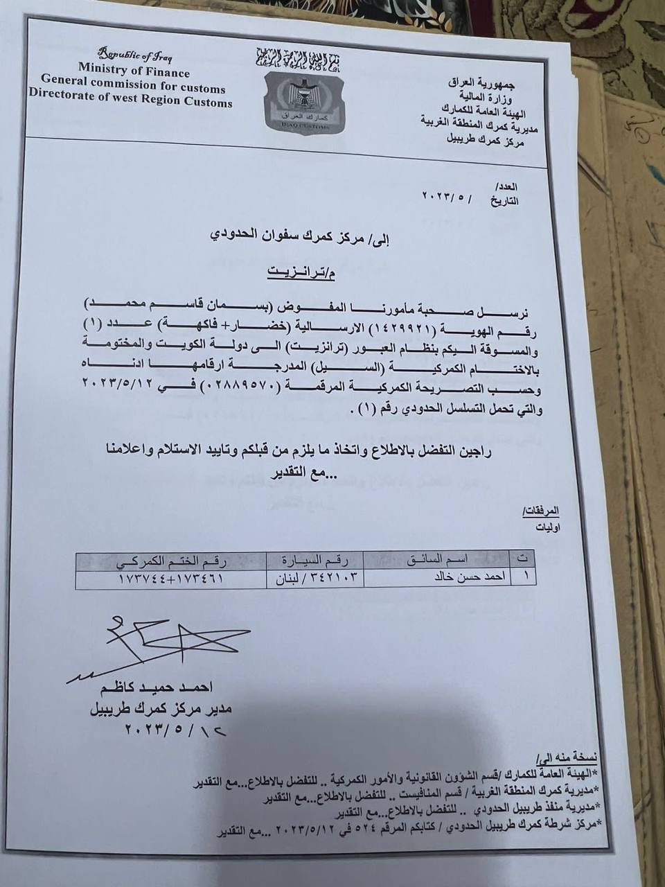 باشر العراق، العمل بالترانزيت البري الدولي من خلال منافذه الحدودية بدخول أول شاحنة قادمة من لبنان عبر منفذ طريبيل مروراً إلى دولة الكويت. ووفقاً لبرقية صادرة عن الهيئة العامة للجمارك العراقية، فإن الإرسالية عبارة عن خضار وفواكه إلى شاحنة واحدة والمسوقة بنظام العبور إلى دولة الكويت.