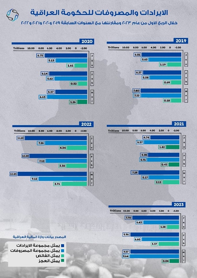 وأضاف، "في مقارنة بين بيانات الاشهر الثلاث الاولى لسنة 2023 مع بيانات نفس الاشهر من السنوات الماضية، يلاحظ ارتفاع كبير في المصروفات وتجاوزت المصروفات لشهر اذار 2023 حاجز الـ 9.65 ترليون دينار".