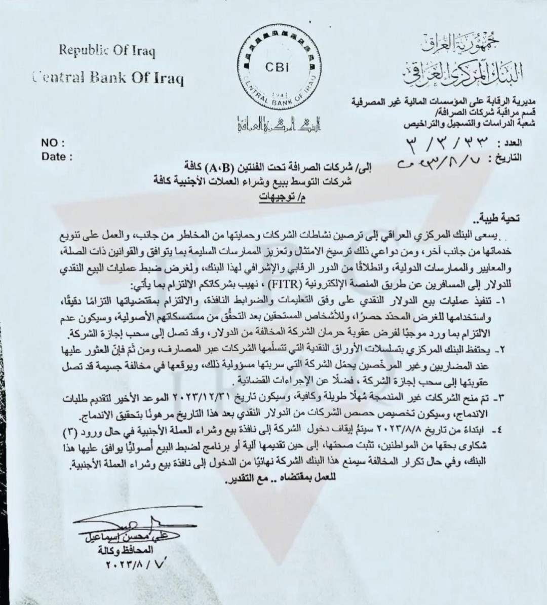 اصدر البنك المركزي العراقي اربعة توجيهات صارمة لشركات الصرافة بشأن بيع الدولار على المنصة الالكترونية.