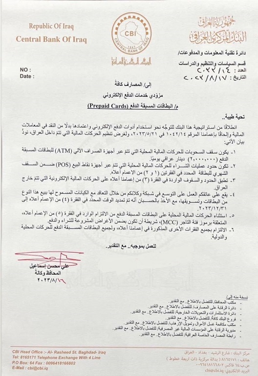 أصدر البنك المركزي العراقي، اليوم السبت 19 أب/أغسطس 2023، توجيهات إلى كافة المصارف باتخاذ ضوابط جديدة تخص البطاقات المسبقة الدفع لغرض تنظيم الحركات المالية التي تتم داخل العراق.
