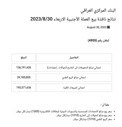 وحسب لائحة البنك، فقد بلغ اجمالي مبيعاته اليوم، 195 ملايين و371 ألفًا و636 دولارًا، غطاها البنك بسعر صرف أساس بلغ 1305 دنانير، لكل دولار للاعتمادات المستندية والتسويات الدولية للبطاقات الالكترونية وبسعر 1310 دنانير لكل دولار للحوالات الخارجية وبسعر 1310 دنانير لكل دولار بشكل نقدي.