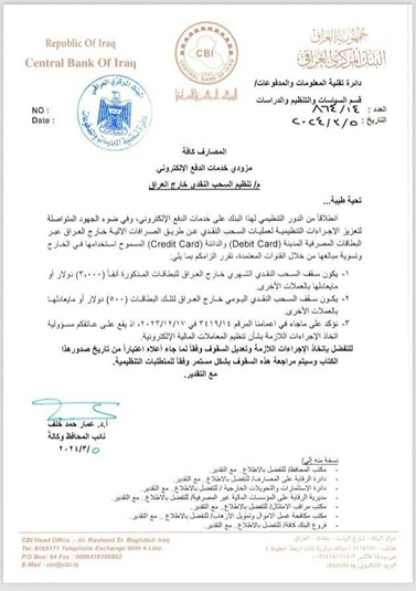 وبحسب وثيقة صادرة من البنك المركزي العراقي فأن سقف السحب النقدي من البطاقات الالكترونية خارج العراق من الدولار، تم تحديدها بواقع 3 الاف دولار شهريا كحد اعلى، و500 دولار يوميا كحد اعلى ايضا، بعد ان كانت 250 دولار يوميا فقط.