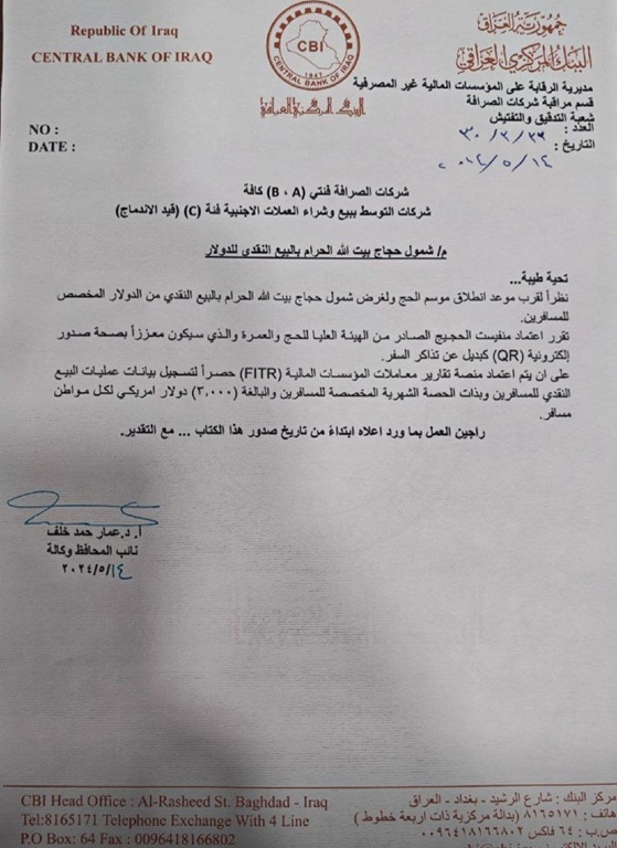 وجاء في وثيقة صادرة عن البنك، انه "نظراً لقرب موعد انطلاق موسم الحج ولغرض شمول حجاج بيت الله الحرام بالبيع النقدي من الدولار المخصص للمسافرين تقرر اعتماد "منفيست" الحجيج الصادر من الهيئة العليا للحج والعمرة والذي سيكون معززا بصحة صدور الكترونية (QR) كبديل عن تذاكر السفر".