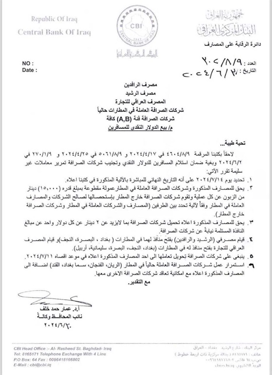 أكد البنك المركزي العراقي، اليوم الاثنين، على حصر منح المسافرين لعملة الدولار الأمريكي من المطارات فقط، وذلك اعتبراً من منتصف تموز الحالي.