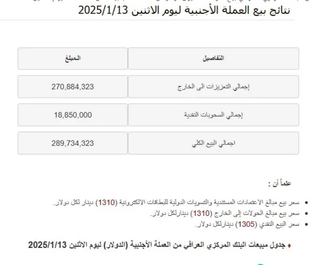 أعلن البنك المركزي العراقي بيع نحو 300 مليون دولار من العملة الأجنبية خلال تعاملات اليوم الاثنين.