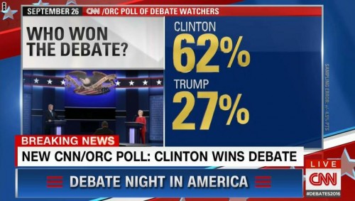 أتلانتا، الولايات المتحدة الأمريكية (CNN)-- أظهر استطلاع رأي أجرته شبكة CNN بالتعاون مع مؤسسة أبحاث الرأي (ORC)، بين الناخبين الذين شاهدوا المناظرة الرئاسية، مساء الاثنين، أن المرشحة الديمقراطية، هيلاري كلينتون، فازت بأول مناظرة رئاسية، بنسبة 62 في المائة، في حين اعتقد 27 في المائة فقط ممن شاهدوا المناظرة أن ترامب كان الفائز.