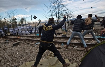 ورشق مهاجرون شرطة مكافحة الشغب بالحجارة ومقذوفات أخرى، واستخدمت الشرطة بدورها خراطيم المياه لتفريقهم، فيما اقتحمت الحشود لفترة وجيزة حاجزا داخل المخيم، لكن قوات الشرطة صدتهم بسرعة.