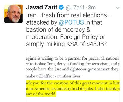 وفي تعلیق أورده في صفحته الشخصیة على موقع التواصل الاجتماعي [تويتر] كتب ظریف ساخراً، ان "إیران التي أنجزت لتوها انتخابات حقیقیة تُهاجم من قبل الرئیس الأمريكي من تلك القاعدة للدیمقراطیة والاعتدال!!".