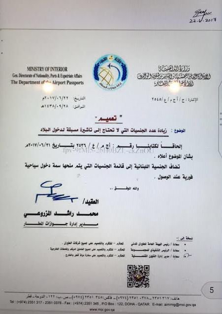 قررت دولة قطر، اليوم الخميس، اعفاء اللبنانيين من تأشيرة الدخول المسبقة لأراضيها.