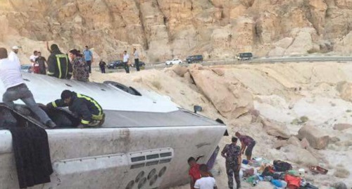 لقي ستة معتمرين أردنيين مصرعهم وأصيب 38 آخرون بجروح من جراء تدهور حافلة كانت تقلهم جنوبي البلاد، فجر الاثنين.