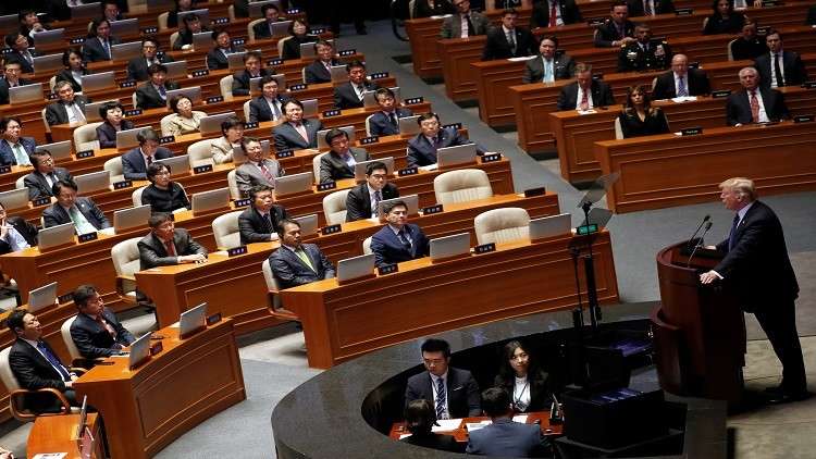 وقال ترامب في خطابه أمام البرلمان الكوري الجنوبي، ان "وقت التبرير قد مر، والآن حان الوقت للقوة"، مسشيرا الى ان "العالم لم يعد قادرا على التحلي بالصبر مع النظام المرير الذي يهدد بالسلاح النووي".
