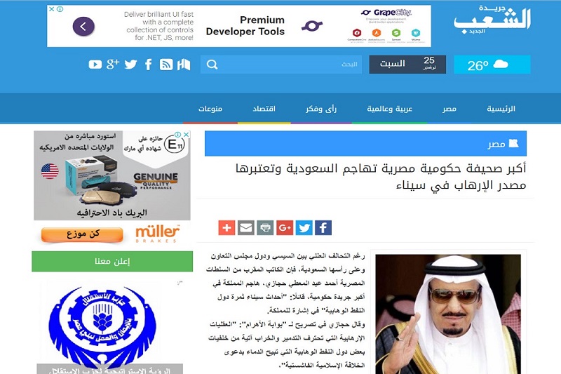 صحيفة الاهرام المصرية كبرى الصحف المصرية استطلعت الاراء في مصر فاشار 90% منهم الى السعودية والفكر الوهابي بالمسؤولية عن مايجري ولم يكن هذا الفكر مسؤول عن هذا التفجير فقط فكل تفجيرات مصر وسيناء خصوصا تعتمد العناصر في تنفيذها على عملاء يمولهم المال السعودي ويحركهم الفكر الوهابي وقالت في تحقيق حول تفجيرات سيناء نقلا عن الكاتب المقرب من السيسي عبد المعطي حجازي انه هاجم المملكة في أكبر جريدة حكومية، قائلًا: "أحداث سيناء ثمرة دول النفط الوهابية" في إشارة للمملكة.
