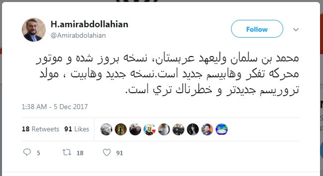 وکتب امیر عبداللهیان في تغریدة له في موقع التواصل الاجتماعي "تویتر" حول ولي العهد السعودي: ان محمد بن سلمان یمثل النسخة المحدثة والمحرك الدافع لفکر الوهابیة الجدیدة.