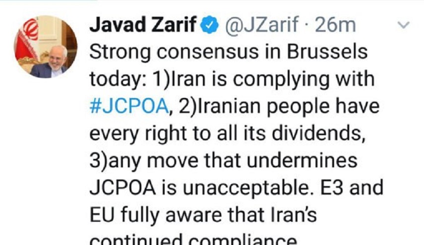 وكتب ظريف في ختام اجتماع بروكسل، أمس الخميس،  تغريدة على حسابه في موقع تويتر  قائلا: