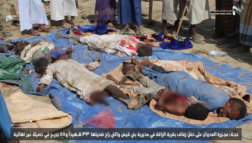وأعلنت وزارة الصحة اليمنية (في صنعاء) استشهاد 33 شخصا على الأقل، وإصابة العشرات إثر قصف قوات تحالف العدوان العربي الذي تقوده المملكة العربية السعودية، أمس الأحد، لحفل زفاف في محافظة حجة شمالي اليمن.