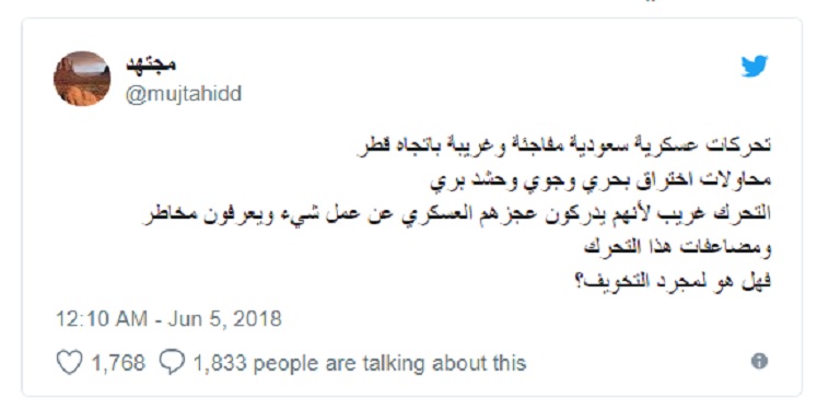 ذكر المغرد مجتهد في تغريده له نشرها اليوم الاثنين ان هناك حركات عسكرية سعودية مفاجئة وغريبة باتجاه قطر ووصفها بانها محاولات اختراق بحري وجوي وحشد بري.