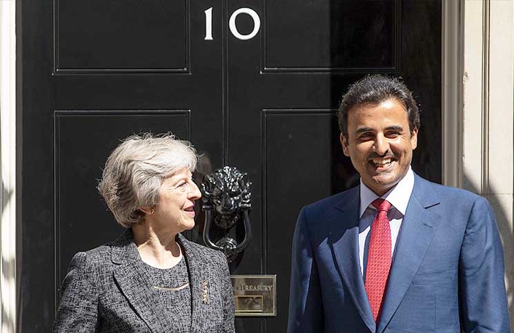 في ثالث أيام زيارته الرسمية لبريطانيا، التقت رئيسة الوزراء البريطانية تيريزا ماي، أمير قطر، الشيخ تميم بن حمد آل ثاني، وأجرت معه محادثات ثنائية، واستضافته على غداء عمل، أمس الثلاثاء.