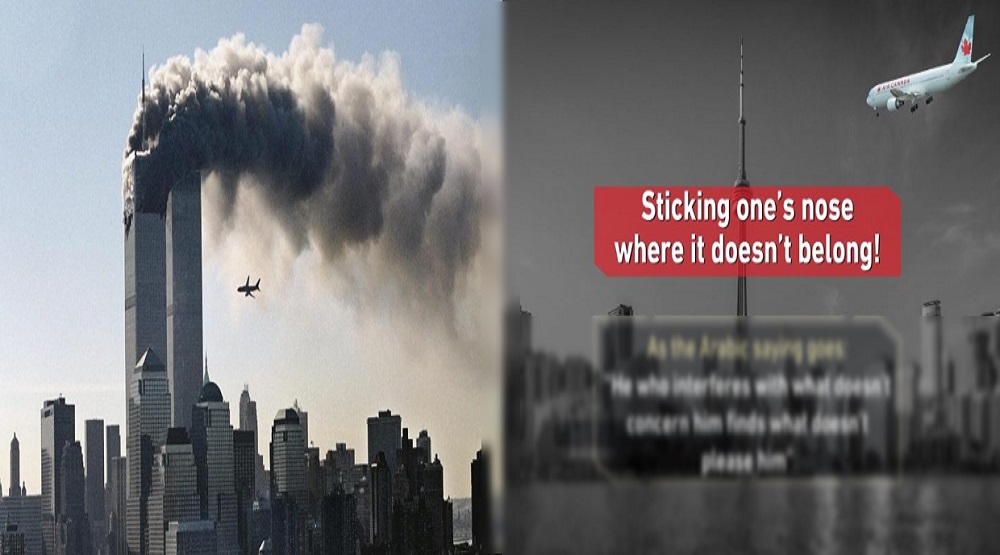 والتغريدة كتب عليها المَثل العربيّ الشهير "من تدخّل فيما لا يعنيه، سمع ما لا يرضيه"، في حين ظهرت في الخلفية طائرةٌ مدنيةٌ تابعةٌ للخطوط الجوية الكندية في طريقها للاصطدام ببرج "CN" الواقع في مدينة تورونتو الكندية.