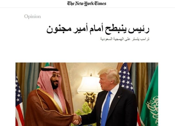 نشرت صحيفة "نيويورك تايمز" الامريكية، الاثنين، مقالاً باللغة العربية في سابقة هي الأولى من نوعها، حمل عنوان "رئيس ينبطح أمام امير مجنون ، ترامب يتستر على الهمجية السعودية" .