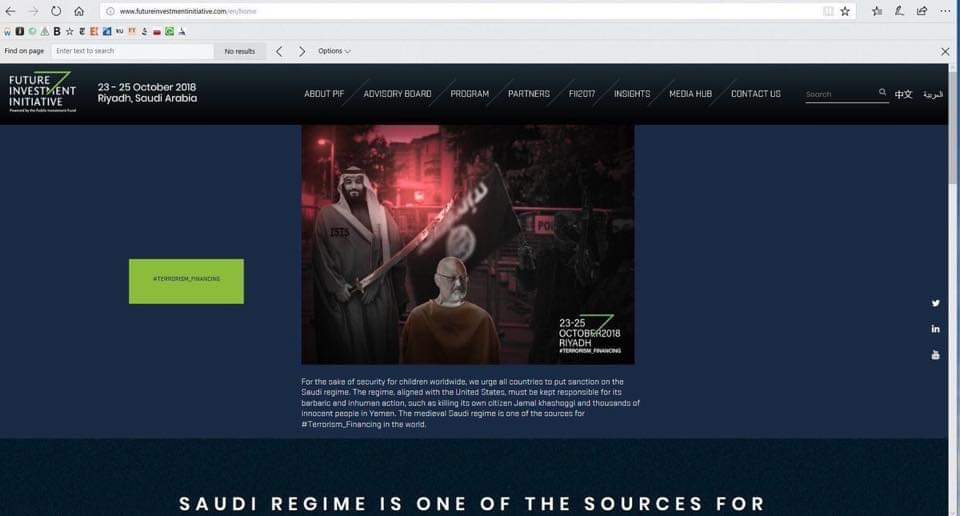 اعلن مركز الاعلام الرقمي، الإثنين، اختراق الموقع الالكتروني لمؤتمر مبادرة مستقبل الاستثمار في السعودية، وذلك قبل ساعات من انطلاق اعمال المنتدى.