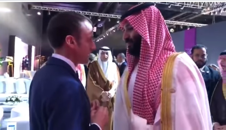 ويوثق الفيديو حديث الرجلين وهما متقاربان، ويظهر فيه ماكرون مبتسما لكنه صارم وهو ينظر مباشرة في عيني ولي العهد السعودي متوجها إليه بانتقادات، على ما يبدو من الشريط، فيما يقف الأمير محمد يومئ برأسه مصدقا على كلمات الرئيس الفرنسي ومبتسما في أحيان كثيرة.
