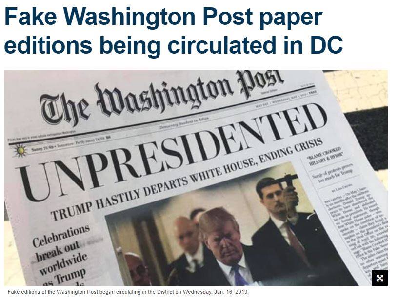 وذكرت الصحيفة أن "ما نشر من نسخ مزيفة هو بتاريخ الأول من أيار للعام المنصرم، وهي نسخة تبدو قريبة جدا من النسخة الأصلية للصحيفة ذاتها واشنطن بوست، المليئة بقصص وصور مناهضة للرئيس الأمريكي دونالد ترامب".