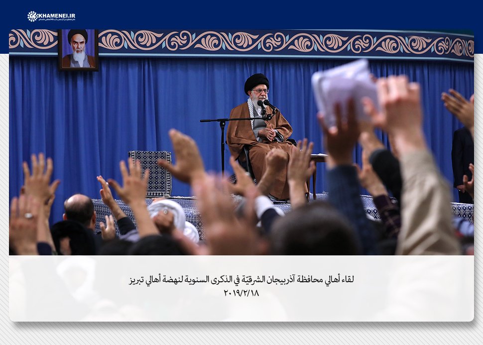 وخلال استقباله الآلاف من أهالي محافظة آذربايجان الشرقية (شمال غرب) صرّح الامام الخامئني بأنه خلال البيان الذي أصدره أخيراً شكر الشعب على مشاركته في مسيرات الحادي عشر من شباط/فبراير الجاري، معتبراً هذا الشكر أقل جداً مما يستحقه الشعب الايراني.
