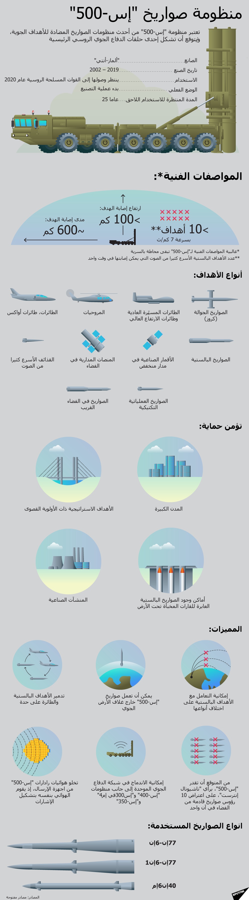 كشفت وسائل إعلام صينية تقريرا تحدث عن مميزات منظومة الدفاع الصاروخية الروسية "إس-500" المستقبلية التي تقوم روسيا بتطويرها وصناعتها.