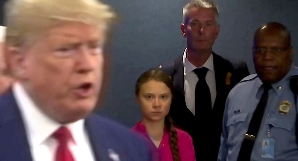 وفي ذات السياق، تداول مستخدمو الإنترنت مقطع فيديو يظهر فيه الرئيس الأمريكي دونالد ترامب وهو يمشي أمام ناشطة المناخ السويدية الشابة غريتا تونبرغ في ردهات الأمم المتحدة في نيويورك.