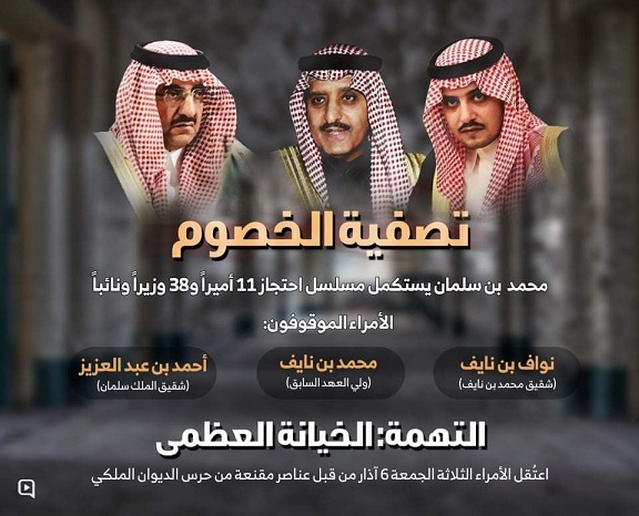 واوضحت المصادر انه تاكد اعتقال اربعة امراء مهمين من العائلة المالكة السعودية وهم كل من احمد بن عبد العزيز ونجله نايف ومحمد بن نايف واخيه نواف
