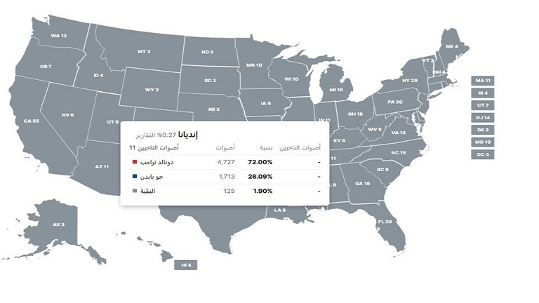 وأفادت قناة "CNN" بأن نتائج فرز 1% من الأصوات في إنديانا، التي تعطي 11 صوتا في المجمع الانتخابي، تشير إلى حصول ترامب على 66.5% مقابل 31.5 لبايدن.
