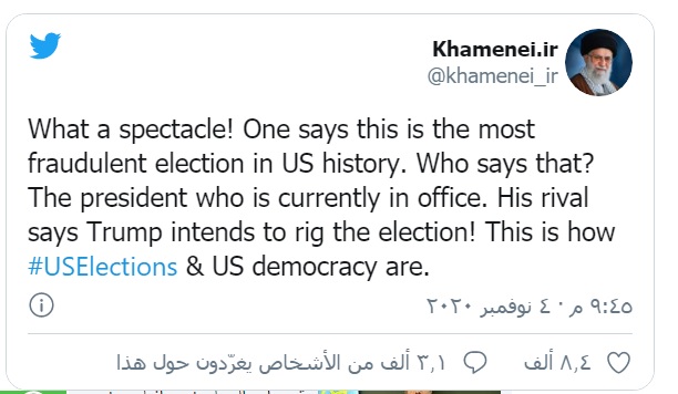وكتب في تغريدة على "تويتر": "يا له من استعراض! يقول أحدهما إنها الانتخابات الأكثر تزويرا في تاريخ الولايات المتحدة. ومن يقول ذلك؟ الرئيس الأمريكي الحالي".