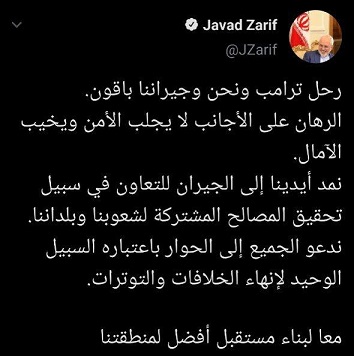 وقال ظريف، في تغريدة نشرها مساء الأحد باللغة العربية عبر "تويتر": "رحل ترامب ونحن وجيراننا باقون. الرهان على الأجانب لا يجلب الأمن ويخيب الآمال".