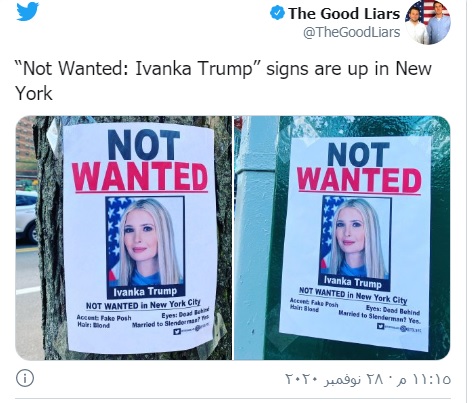 انتشرت ملصقات في نيويورك وعليها صورة ايفانكا ترامب، ابنة الرئيس الأمريكي دونالد ترامب، مرفقة بعبارة "Not Wanted"، بعد أن واجهت انتقادات لعدم منع والدها من تنفيذ سياسات مثيرة للجدل.