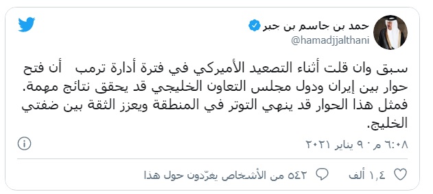 وفي سلسلة تغريدات له عبر "تويتر"، كتب بن جاسم آل ثاني: "سبق وأن قلت أثناء التصعيد الأميركي في فترة إدارة (الرئيس الأمريكي الحالي دونالد) ترامب أن فتح حوار بين إيران ودول مجلس التعاون الخليجي قد يحقق نتائج مهمة. فمثل هذا الحوار قد ينهي التوتر في المنطقة ويعزز الثقة بين ضفتي الخليج".
