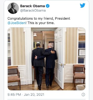 واستبق أوباما حفل التنصيب بوقت قليل ليغرد قائلا لبايدن: "مبروك صديقي الرئيس جو بايدن هذا هو وقتك".